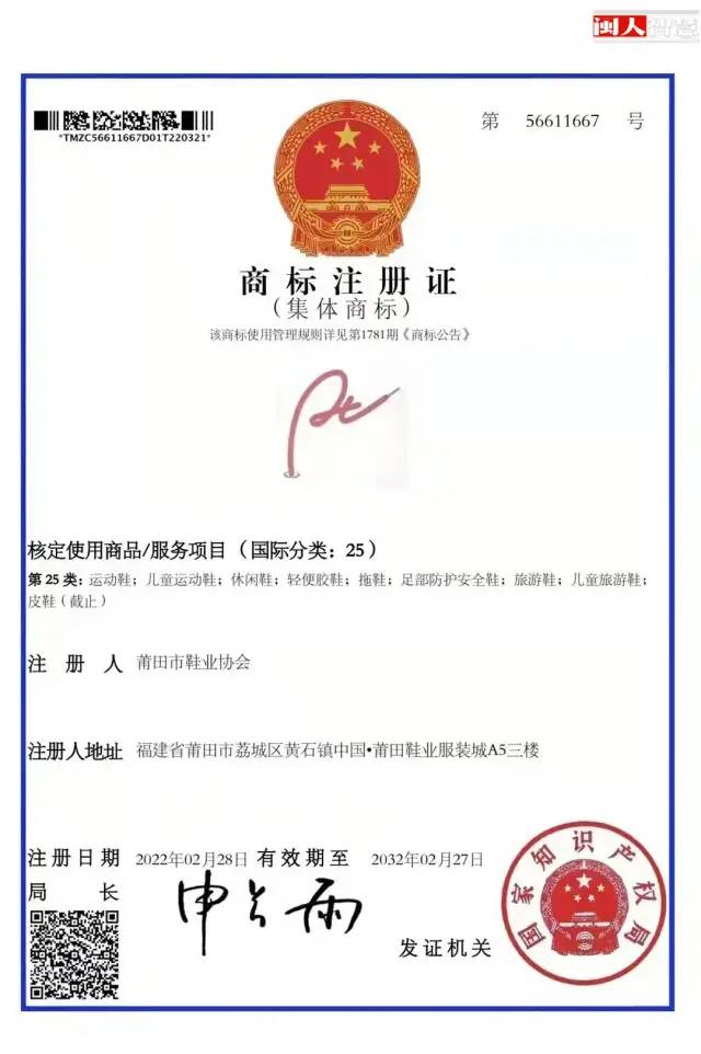 圖:莆田鞋集體商標(biāo)注冊(cè)成功 / 來源網(wǎng)絡(luò)